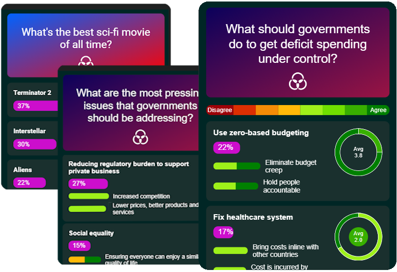 Crowdsourced public opinion. See where you stand. Have your voice heard. The public narrative is driven by algorithms, influencers and media, take back control!